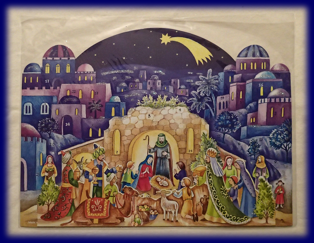 アドベント・カレンダーは、12月1日から始まり、クリスマスの訪れを待ちながら一つずつ窓を開いていくのです。(絵の中に日付があり、窓が開くようになっています。)